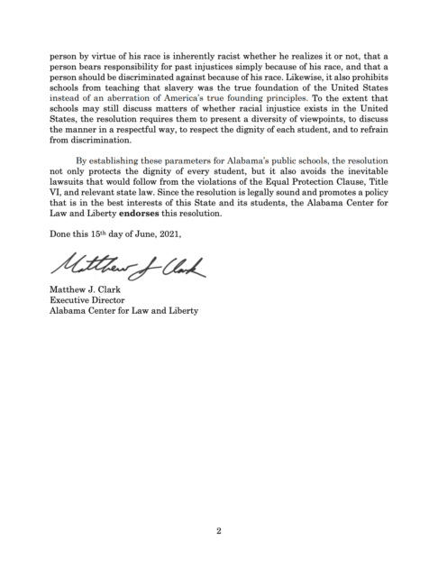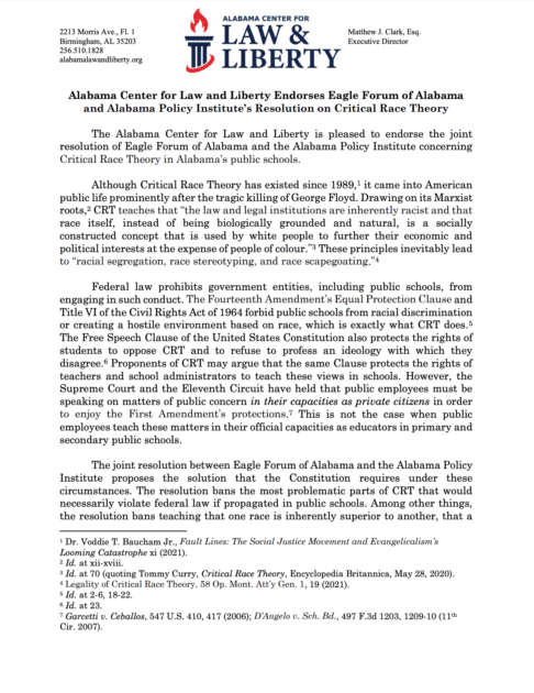 The Alabama Center for Law and Liberty is pleased to endorse the joint resolution of Eagle Forum of Alabama and the Alabama Policy Institute concerning Critical Race Theory in Alabama’s public schools.